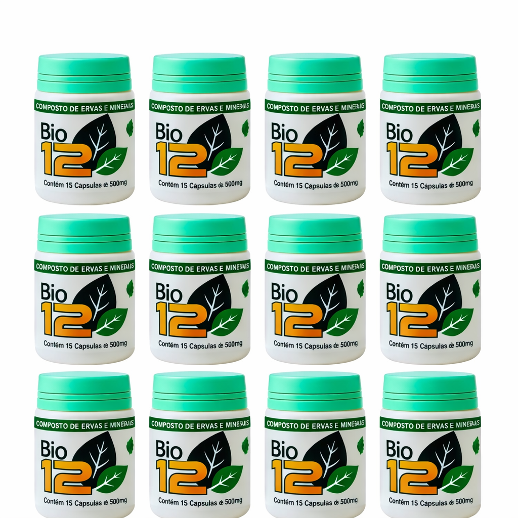Este kit com 12 frascos do Bio 12 suplemento natural oferece excelente custo-benefício para quem deseja uso contínuo.