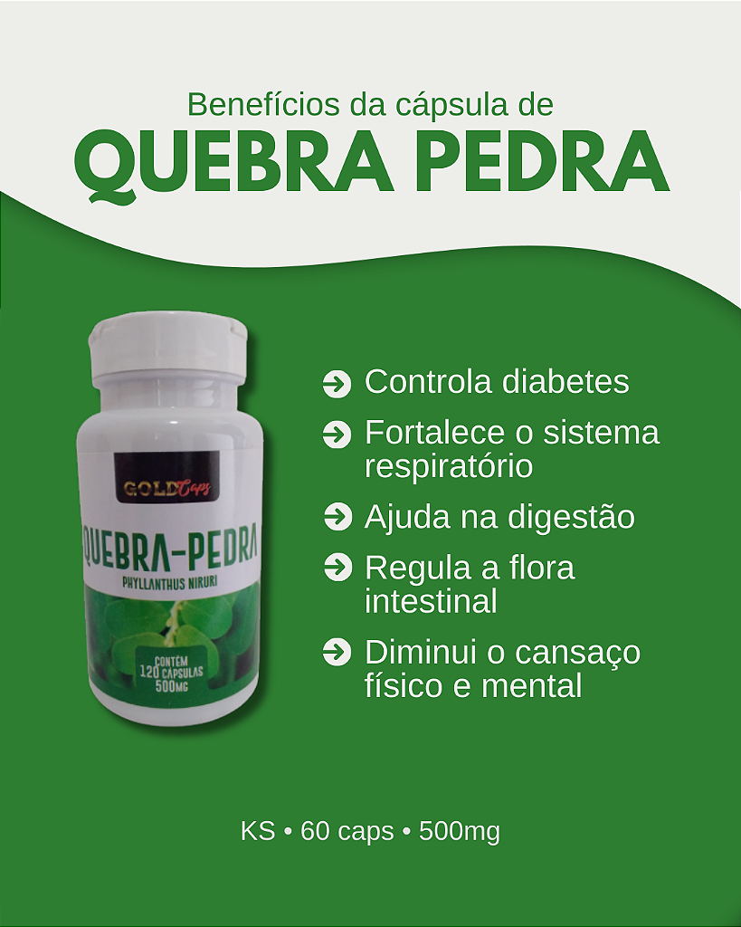 O Quebra Pedra Gold Caps é um suplemento à base de extratos concentrados de plantas reconhecidas por seus efeitos diuréticos e protetores do trato urinário. Sua fórmula combina Quebra Pedra, Chapéu de Couro, Cavalinha e outros ativos naturais que ajudam na prevenção e eliminação de cálculos renais, auxiliando na saúde dos rins e da bexiga.