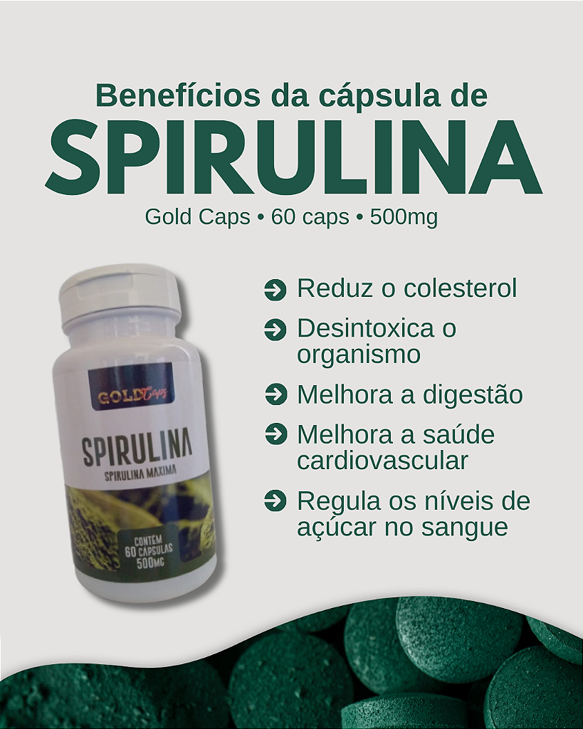 Spirulina (Arthrospira platensis) 500mg por cápsula, sem aditivos ou conservantes.